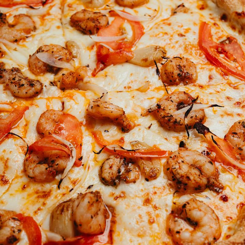 Small $18.00 | Large $25.00 | Extra Large $28.00 • Spicy garlic butter, mozzarella, tomatoes, roasted garlic, onion, and shrimp.