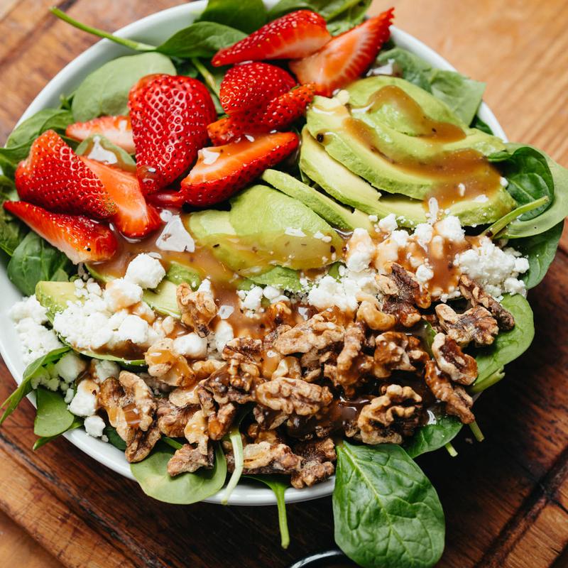Spinach, strawberries, avocado, walnuts, and goat cheese with vegan honey balsamic vinaigrette. Eat Fit™ with 1 oz dressing.