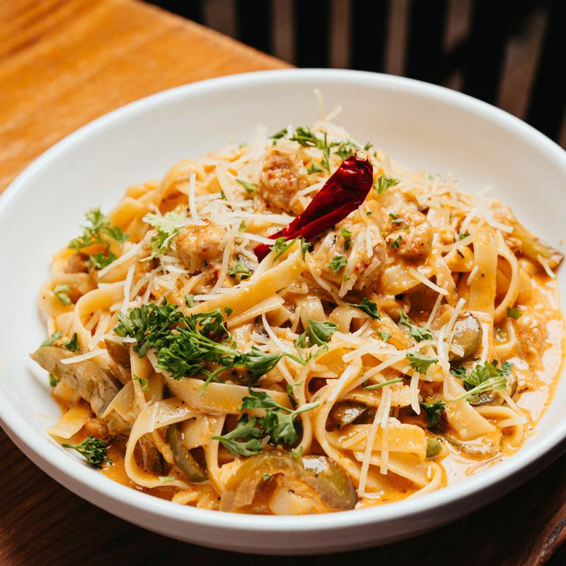 Spicy alfredo sauce with creole seasoning, and shrimp.
