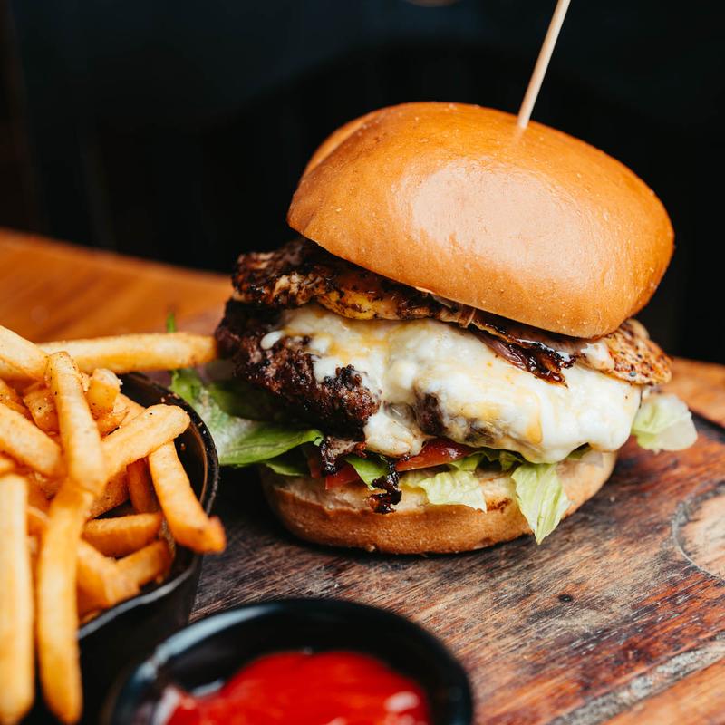 Burger, pepper jelly aioli, fried egg, cheese blend, red onions, lettuce, and tomato | Add Avocado +$1.00 | Add Bacon +$1.00