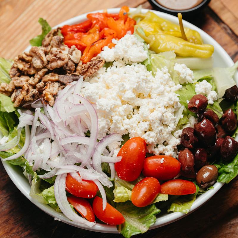 Lettuce, kalamata olives, roasted red peppers, cherry tomatoes, red onions, walnuts, feta cheese, and pepperoncini with balsamic vinaigrette.