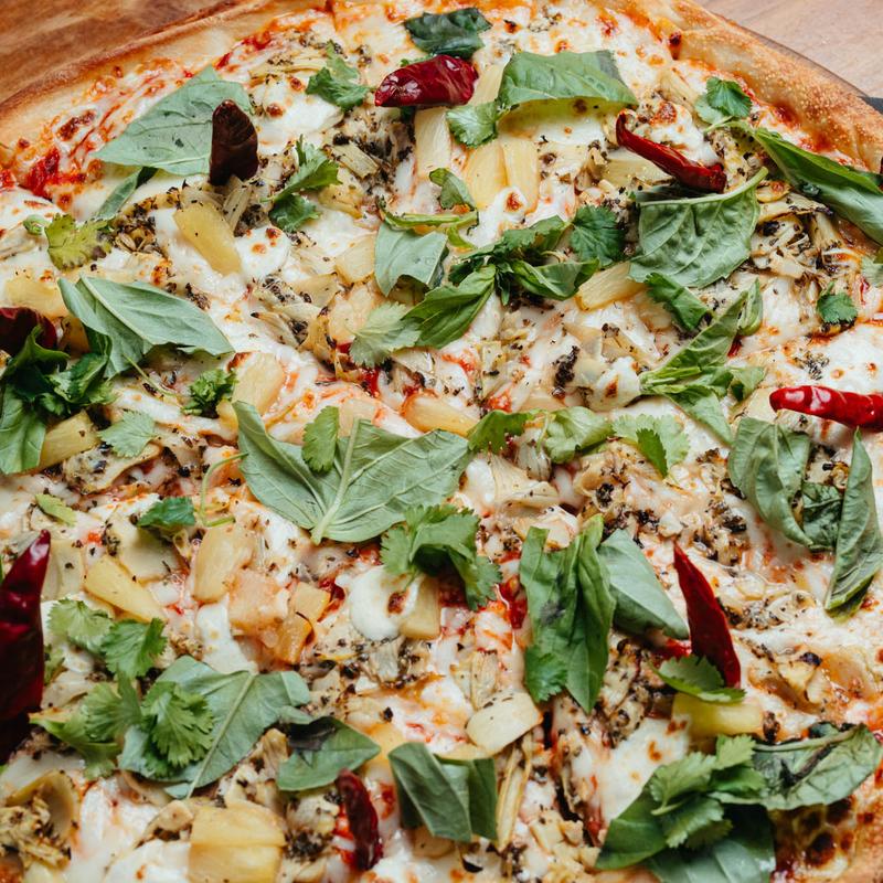 Small $16.00 | Large $22.00 | Extra Large $25.00 • Marinara, mozzarella, artichoke, pineapple, roasted garlic, fresh mozzarella, fresh basil, cilantro, and chili pepper. Eat Fit™ on whole wheat, and as vegan on whole wheat | Serves 2 people.